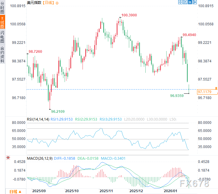 周一亚市时段,美元指数震荡下行,现交投于97.10附近,日内跌幅约0.35%,此前一度刷新96.94的逾四个月低点,延续了前两个交易日的显著跌势。