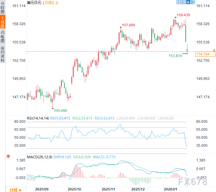 周一(1月26日)亚市时段,美元兑日线震荡下行,现交投于154.20附近,日内跌幅约0.95%,此前一度触及近十周低点153.87,延续前一交易日跌势,上周五下跌逾1.7%。